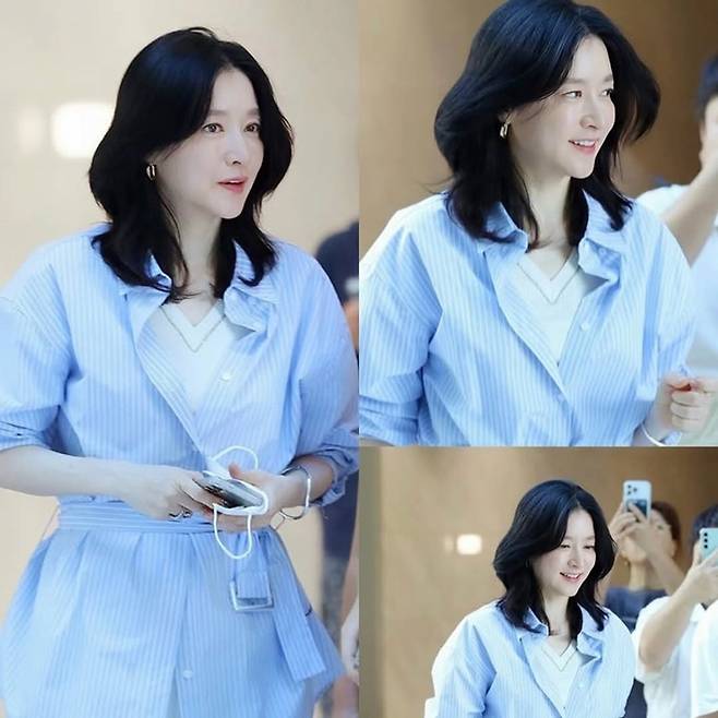 공개한 사진에서 이영애는 허리 라인을 잡아주는 벨트 디테일이 강조된 화사한 블루 스트라이프 셔츠 원피스 출근룩으로 여성스러우면서도 세련된 분위기를 선보였다.