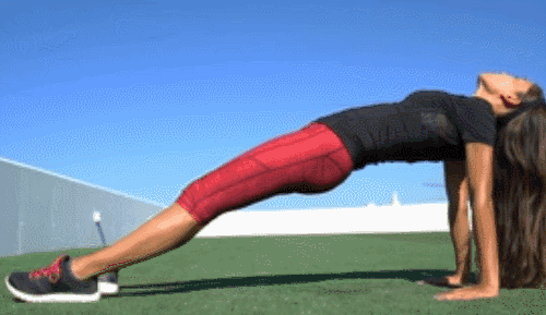 바닥에 앉아 다리를 앞으로 뻗습니다. 손을 엉덩이 뒤쪽 바닥에 놓고 손끝은 앞쪽을 향하게 합니다. 손으로 바닥을 눌러 엉덩이를 공중으로 들어 올립니다. 어깨에서 발목까지 사선이 되도록 몸을 곧게 유지합니다.