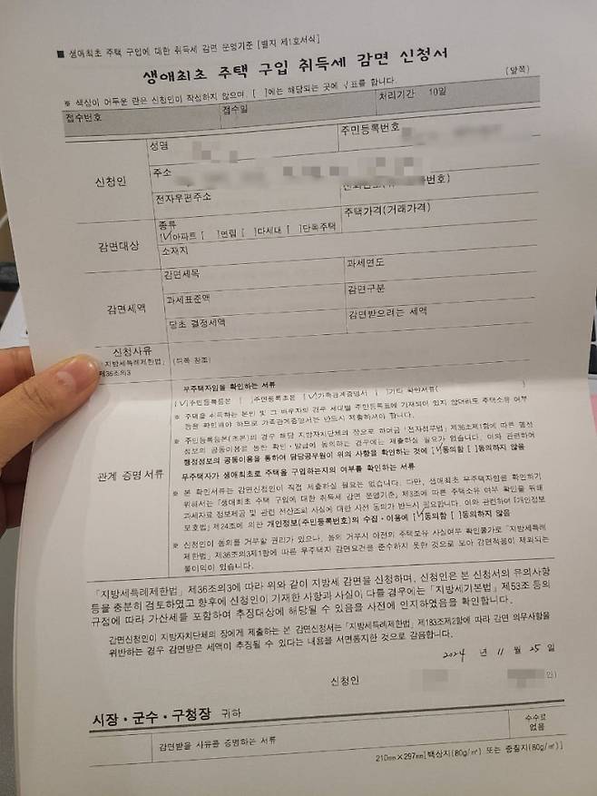 등기서류를 내면서 생애최초 취득세 감면신청서도 함께 제출했어요.