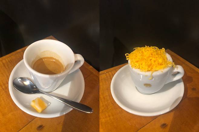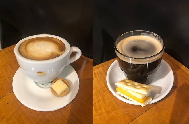 카페 관계자의 권유에 따라 에스프레소를 먼저 마신 다음, 커피잔 바닥에 깔린 설탕을 콜비잭 치즈와 함께 먹었다. 마치 버터를 먹는 듯한 치즈 맛이 묵직한 에스프레소 맛과 대비되면서 오묘한 조화를 이뤘다.
