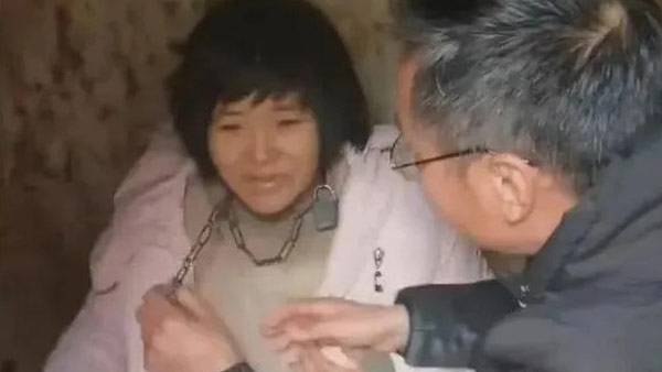 중국 장쑤성 쉬저우의 한 농촌 마을에서 쇠사슬에 목이 묶인 채 헛간에 갇힌 채 발견된 여성. 인신매매로 자녀 8명을 출산했다는 사실이 드러났다. (출처 : 바이두)