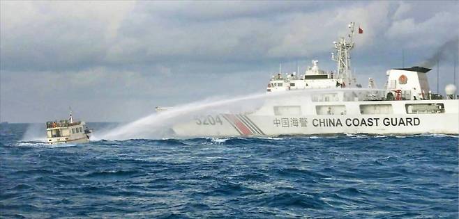 중국은 이른바 '구단선'을 내세우며 남중국해 대부분을 자국 영해로 주장하고 있고, 필리핀의 배타적 경제수역(EEZ) 내에서도 해경 선박과 해상민병대를 동원해 필리핀 어선과 보급선을 방해하고 있습니다.