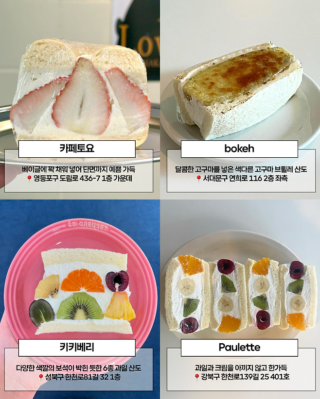 안에 들어가는 크림과 과일, 내용물의 형태에 따라 다양한 배리에이션이 가능해 선택지도 많고 사진 찍기에도 좋아 큰 인기죠. 서울에서도 제대로 된 후르츠 산도를 맛볼 수 있는 맛집이 많답니다. 지금 다 같이 한 번 살펴볼까요?