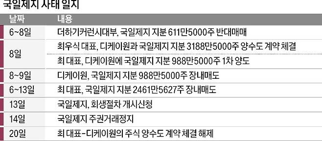 13일 국일제지는 급작스럽게 회생절차를 신청했다. 최 대표와 디케이원은 나머지 주식 거래를 오는 29일 마무리한다는 입장이었지만 20일 계약은 해지됐다. 디케이원이 주총 이전에 새로 선임할 이사 및 감사 후보 지명 등 통지 의무를 이행하지 않았다는 이유에서였다. 시장에서는 계약 자체가 허위인 것으로 보고 있다. 거래 정지 전에 주식을 현금화할 기회를 마련하기 위한 일종의 ‘쇼’가 아니냐는 의심을 사고 있다. 최 대표가 미공개정보를 이용해 주식을 거래했다면 이 역시 자본시장법 위반이다.