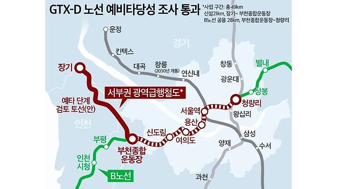 김포 장기역에서 부천종합운동장역을 잇는 GTX-D 노선이 최근 예비타당성조사를 통과하며 사업 추진에 탄력을 받았다. 이 노선은 장기역과 인천공항역에서 출발해 부천 대장을 지나 삼성역을 거쳐 하남 교산과 강원 원주까지 이어지는 ‘더블 Y자’ 형태로 설계됐다.