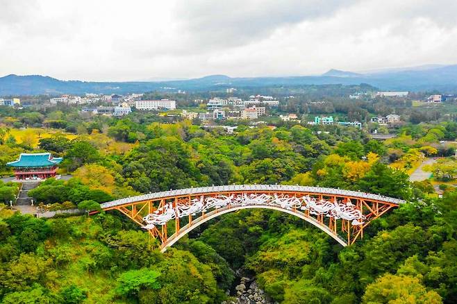 선임교는 인스타 사진을 찍기 위한 완벽한 배경을 자랑하는 제주도 여행지입니다. 천제연폭포와 중문관광단지를 잇는 이 다리는 국내 최초의 오작교 형태로, 그 자체로 독특하고 아름다운 사진을 남길 수 있는데요.