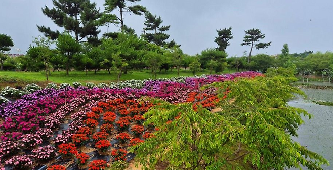 군산 은파호수공원 & 군산수목원: 수국과 호수, 산책로가 어우러져 여유로운 산책이 가능해요.