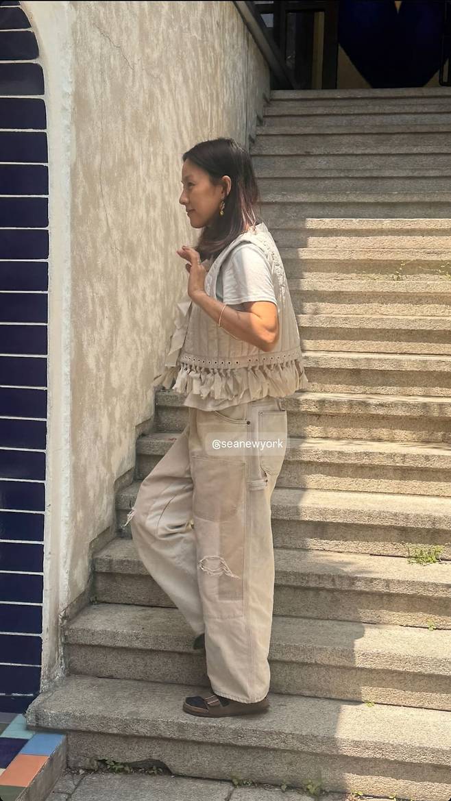 이효리는 빈티지한 디테일이 살아있는 러프한 베이지 컬러의 와이드 팬츠에, 잔잔한 장식이 돋보이는 프린지 베스트를 매치해 자유로운 보헤미안 무드를 완성했습니다.