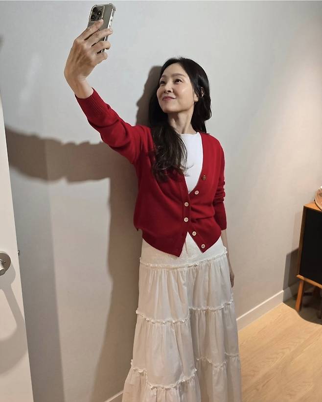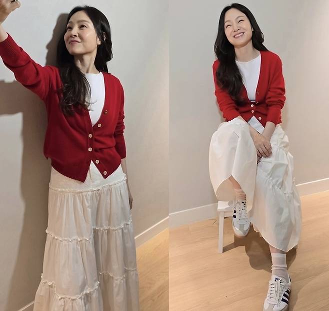 선명한 레드 컬러의 크롭 가디건은 시선을 집중시키며 생기를 더했고, 화이트 티셔츠와 레이어드해 안정감 있는 톤 조합을 완성했습니다.