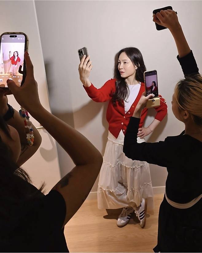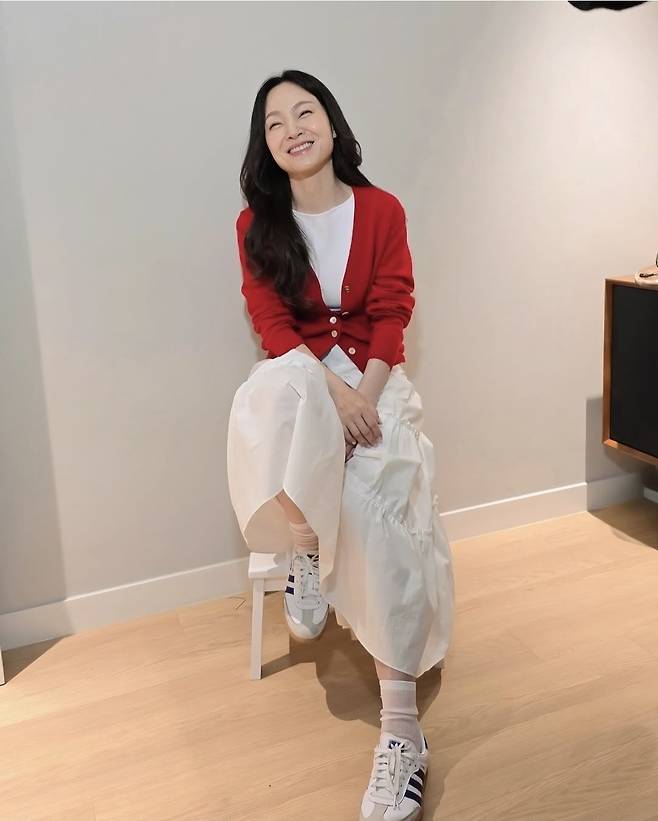 신발은 클래식한 삼선 스니커즈를 매치해 전체적인 스타일에 편안함과 활동성을 더했으며, 내추럴한 웨이브 헤어와 미니멀한 메이크업으로 친근하고 밝은 무드를 마무리했습니다.