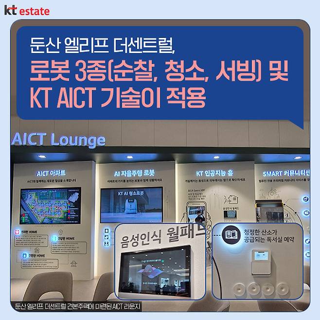 이러한 가운데, 대전 최초로 KT의 AICT 기술이 도입되는 아파트가 등장해 화제를 모으고 있습니다. 바로 대전 서구 괴정동 KT인재개발원에 건립되는 ‘둔산 엘리프 더센트럴’인데요. 지난 8일 견본주택을 열고 본격 분양에 나서 수요자들의 관심이 집중되고 있습니다.