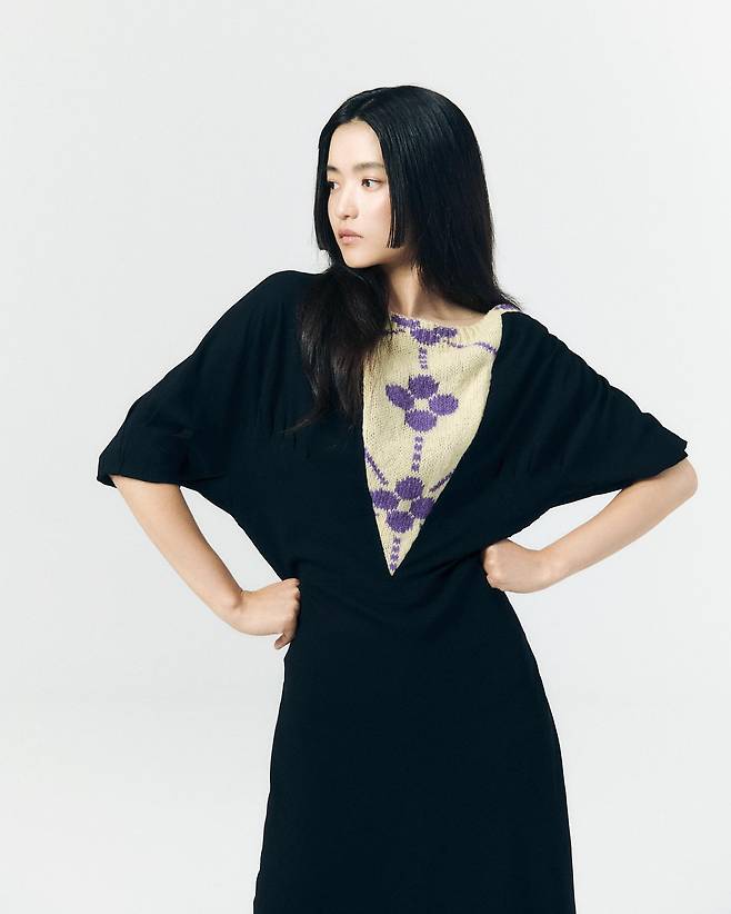 배우 김태리의 드레스룩을 살펴보겠다. 김태리는 블랙 원피스에 베이지와 보라색 니트 패턴이 더해진 독특한 디자인을 연출하고 있다. 어깨와 소매가 넉넉하게 떨어지는 실루엣이 편안하면서도 세련된 분위기를 자아낸다. 니트의 삼각형 패턴과 플라워 모티브가 포인트로 작용해, 단조로운 블랙에 감각적인 변주를 더한다