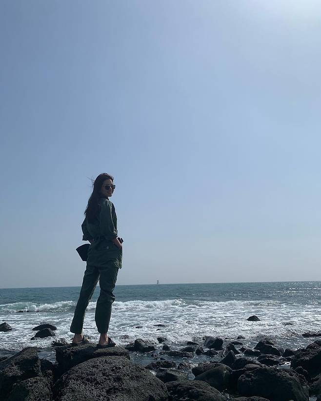 김태리는 올리브 컬러의 점프수트와 선글라스를 착용한 채 바닷가 암석 위에 서 있다. 실용적이고 활동적인 아웃도어룩을 연출하면서도, 슬림한 실루엣과 미니멀한 소품 선택으로 도시적인 감각을 잃지 않았다. 자연과 어우러진 스타일링이 자유로운 분위기를 완성한다