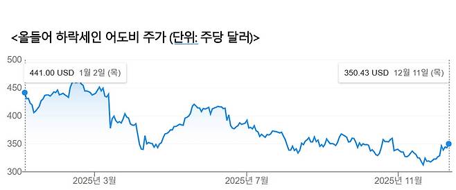 어도비가 4분기 실적을 발표한 10일(현지시간) 미국 나스닥에서 어도비는 정규장 동안 0.35% 하락했다. 실적발표 후 시간외 거래에선 0.80% 추가로 내렸다. 월가의 기존 컨센서스(시장 평균 전망)을 소폭 웃도는 매출 결과와 내년 전망을 내놨는데도 투심을 잡지 못한 모양새다.