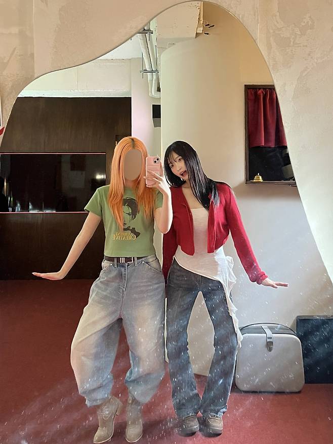 레드 상의의 강렬함을 중화하면서 전체적으로 균형감을 잡아주는 스타일이에요.