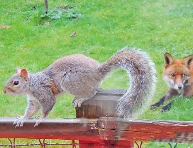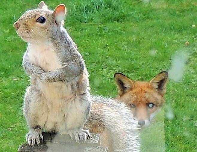다람쥐에게 반응하기는 커녕 오히려 시큰둥한 모습을 보인 여우. 사진을 찍은 마크 가드너는 평소 다람쥐들이 먹이를 얻으려고 집에 찾아왔다고 전했죠.
