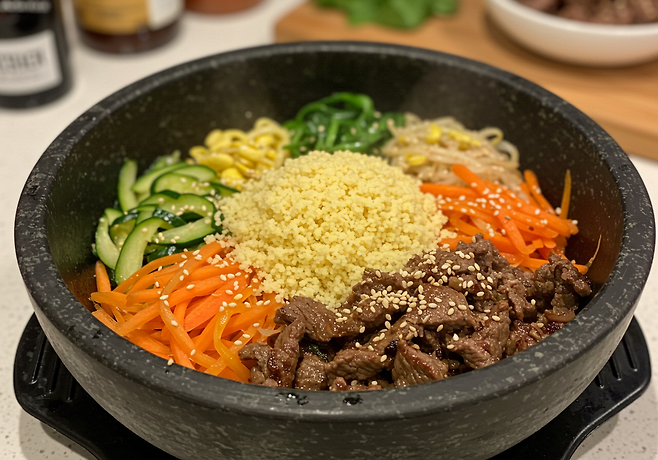 - 재료: 쿠스쿠스 1컵, 불고기용 소고기 100g, 당근, 시금치, 버섯 등 각종 채소, 참기름, 고추장