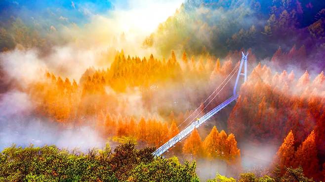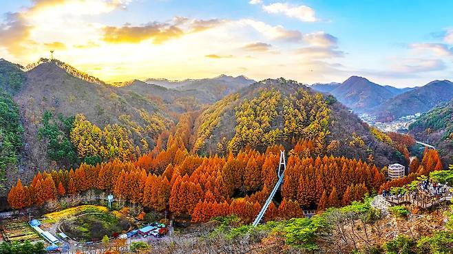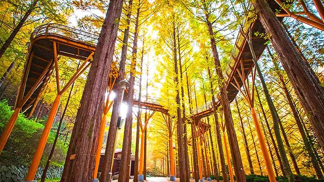 장태산의 가을을 가장 특별하게 즐기는 방법은 '숲속어드벤처'와 '출렁다리'를 이용한 스카이웨이 트레킹이다.