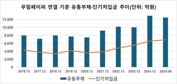 무엇보다 단기차입이 확대되는 부채구조는 염려스러운 대목이다. 무림페이퍼의 단기차입금은 올 6월 말 6896억원으로 유동부채의 55.4%에 달한다. 직전 5년간 추이를 보면 △2020년 말 3607억원 △2021년 말 3830억원 △2022년 말 4826억원 △2023년 말 5545억원 △2024년 말 6534억원 등으로 꾸준히 늘어 이제는 7000억원에 육박했다.