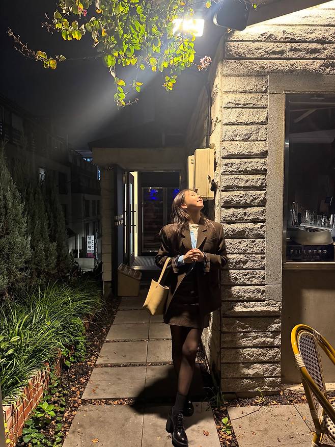 밤 공기가 서늘해지는 계절, 안소희는 톤 다운된 브라운 셋업으로 분위기를 완성했어요.