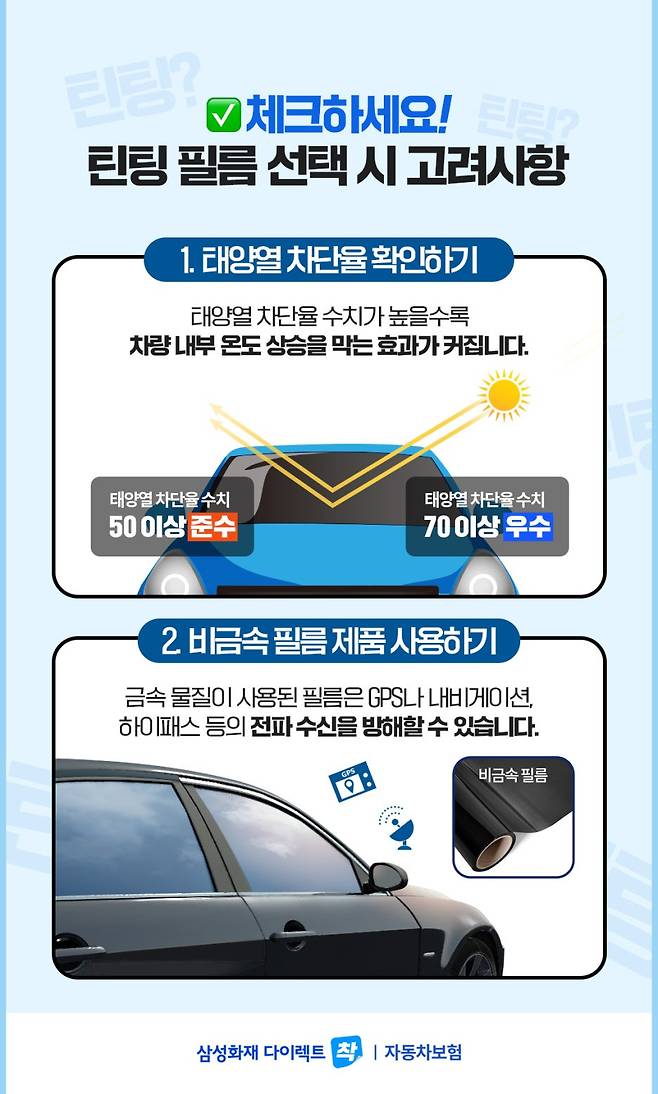 또한 열 차단 기능이 포함된 틴팅 필름은 비금속 필름 제품을 사용하는 것이 바람직합니다. 금속 물질이 사용된 필름은 차량 내부의 전파 수신을 방해해 GPS나 내비게이션, 하이패스 등의 상황에서 인식이 제대로 되지 않는 문제가 발생할 수 있기 때문입니다.