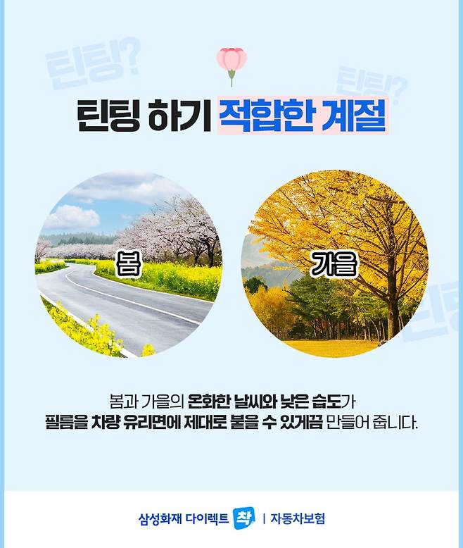 자동차 틴팅을 하기로 결심하셨다면 봄과 가을에 하시기를 추천드립니다. 틴팅 작업이 끝난 뒤에는 필름이 유리면에 완전히 안착될 때까지 일정 시간이 지나야 하는데요. 봄과 가을의 온화한 날씨와 낮은 습도가 필름을 차량 유리면에 제대로 붙을 수 있게끔 만들어 주기 때문입니다.