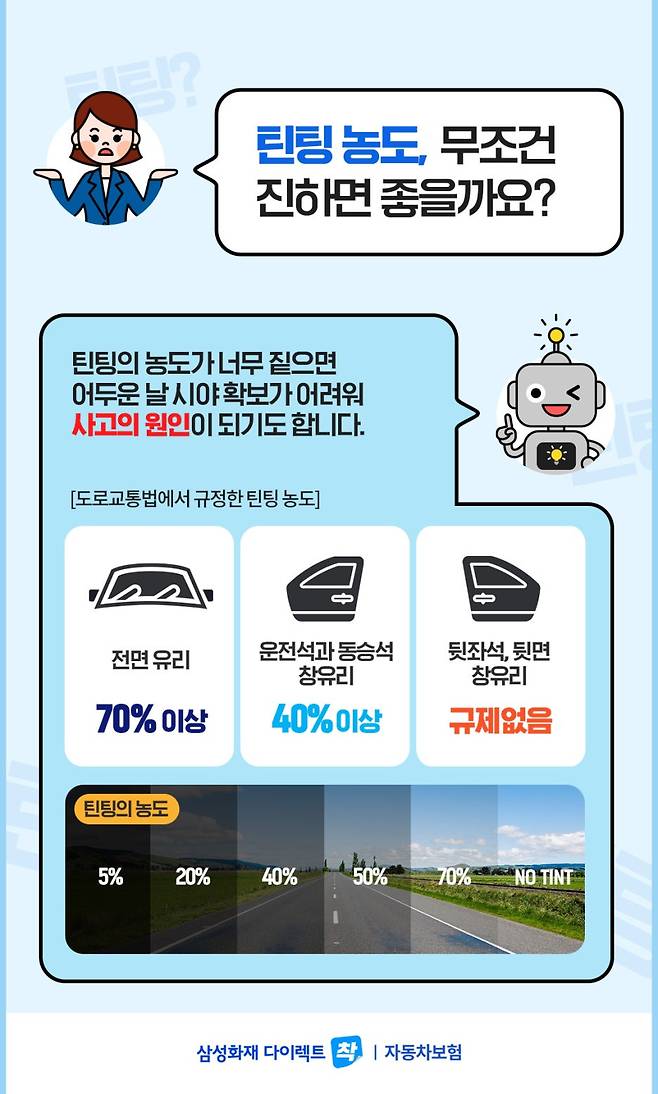 뿐만 아니라 우리나라에서는 법적으로 틴팅의 농도를 규정하고 있습니다. 전면 유리는 70% 이상, 운전석과 동승석의 창유리는 40% 이상 그리고 뒷좌석과 뒷면 창유리는 따로 규제 사항이 없는데요. 보통 우리나라의 자동차 틴팅 농도 평균 수치는 전면 35%, 측후면 15%라고 합니다. 안전한 운전을 위해 적정한 농도의 틴팅을 하는 건 어떨까요?