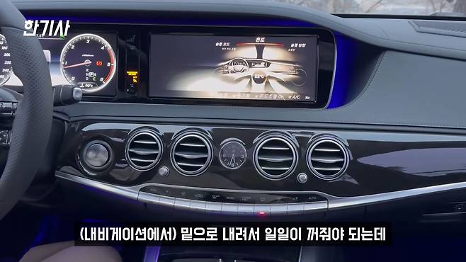 이 차량의 조작성은 단점입니다. E 클래스 때부터 사용했던 기어봉, 오토 스톱 같은 것은 동일하게 편한데, 에어컨 공조 장치 끄는 버튼이 따로 구비되어 있지 않습니다. 보통 송풍 밑에 버튼들이 많은데, 여기서 공조 조작을 못합니다. 켜는 건 할 수 있는데, 아무리 1단 밑으로 눌러도 꺼지지 않습니다. 메뉴 버튼에 들어간 다음에 밑으로 내려서 일일이 꺼 줘야 되는데 귀찮습니다.