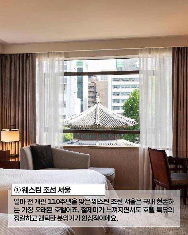 올해 개관 110주년을 맞은 웨스틴 조선 서울은 국내 현존하는 가장 오래된 호텔이죠. 저층을 예약하시면 팔각지붕의 환구단 뷰를 만끽할 수 있어요.