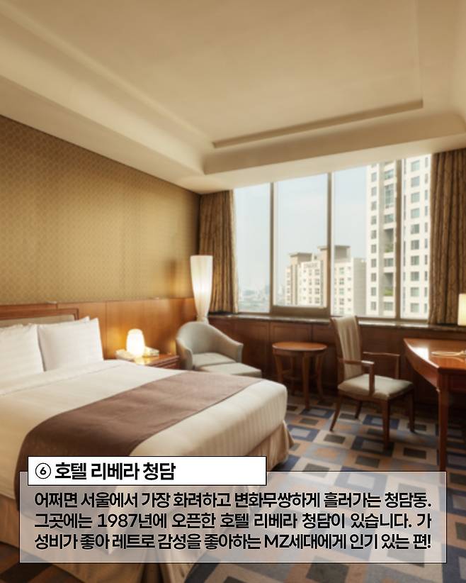 어쩌면 서울에서 가장 화려하고 변화무쌍하게 흘러가는 청담동. 그곳에는 빈티지한 패턴의 카펫, 벽지, 커튼, 체리색 몰딩과 가구 등을 그대로 간직해 시간 여행을 하게 만드는 호텔이 있습니다. 1987년에 오픈한 호텔 리베라 청담은 가성비가 좋아 레트로 감성이 잘 맞는 MZ세대에게 인기 있는 편!