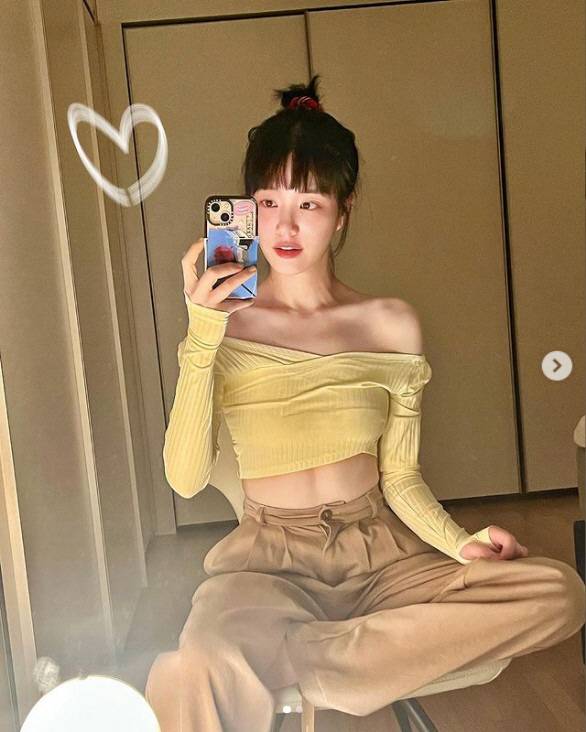 이유비는 오픈숄더 의상을 입고 셀피를 남기고 있는 모습.