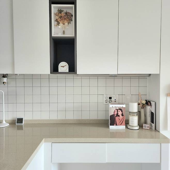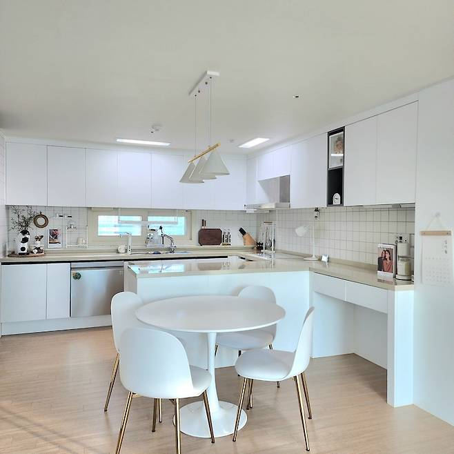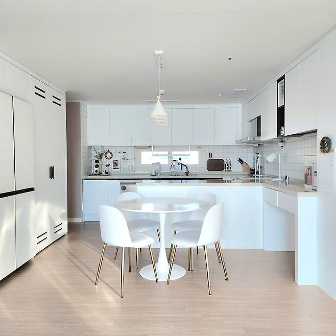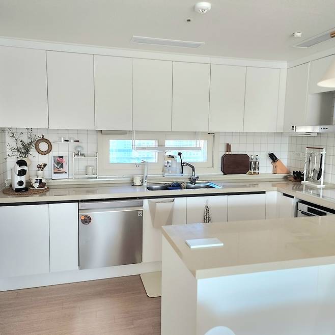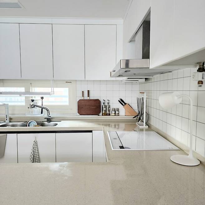 아무래도 주부이고 요리를 즐겨 하다 보니 집에서 가장 좋아하고 신경 쓰는 공간이 주방이에요. 저희 집 주방은 넓게 잘 빠졌고 수납 공간도 많아요. 최근 타일 덧방 시공을 해서 전체적으로 화이트 톤에 맞췄습니다. 저한테 동선이 편하도록 물건들 위치를 다 잡아 놨고, 최대한 수납장에 넣을 건 다 넣고 밖에 꺼내 놓는 것들을 줄였더니 딱 보기에는 미니멀 해 보여요.