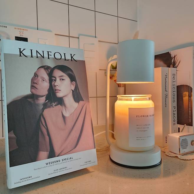 모형 책과 캔들 워머, 블루투스 스피커로 꾸며봤어요. 고기를 굽거나, 생선을 굽고 나면 집 안에 냄새가 진동을 하는데 양초가 냄새를 빨리 잡아준다고 해서 그때마다 켜 놓습니다.