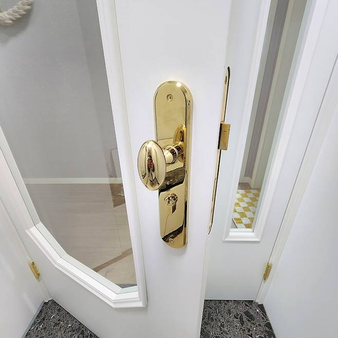 제가 골드 색상을 좋아하기도 하고 현관 줄눈 시공도 골드 색상으로 해서 문 손잡이도 골드로 정했어요. 손잡이 모양은 여러 디자인이 있었는데 저는 동글동글한 게 귀엽고 색다르더라구요.