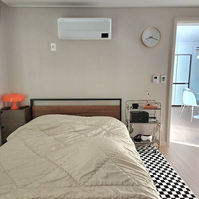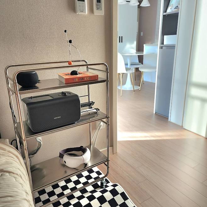 제가 미드센추리 모던 감성의 가구, 소품들을 정말 좋아합니다! 안방에는 체커보드 미니 러그를 깔아 놨어요. 그리고 3단 이동식 철제 트롤리 위에 온수 매트 본체와 블루투스 스피커, 모빌을 올려두고 사용 중입니다.