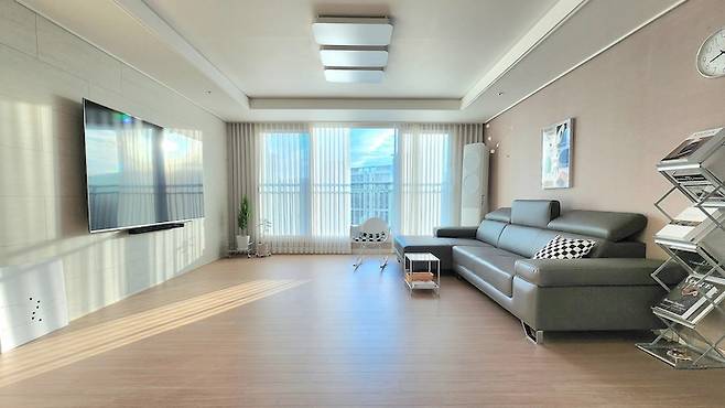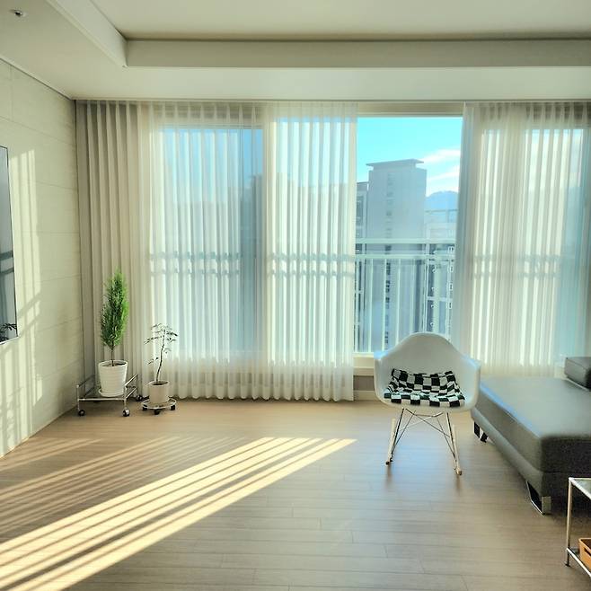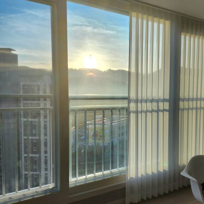 동향 집은 아침에 기분 좋은 햇살을 볼 수 있다는 게 장점인 것 같아요. 아침에 집 안으로 들어오는 햇살을 보면 하루 일이 잘 풀릴 것 같은 기분이 듭니다. 저희 집은 맞은편에 아파트가 있긴 한데 사이사이로 산이 보여서 나쁘지 않은 뷰라고 생각해요.