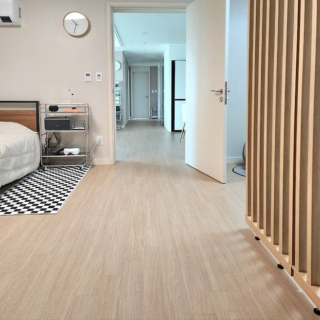 거실 제외 각 방들에는 블라인드를 색상을 통일해서 셀프로 설치했어요. 블라인드를 올리고 내릴 땐 좀 번거롭긴 하지만 블라인드도 커튼 못지않게 깔끔하니 예쁜 것 같아요. 침대 옆에는 브라운 색상의 도어형 공간 박스를 두고 미드센추리 모던 감성 주황색 머쉬룸 무드등을 올려 뒀어요. 벽이 좀 허전해서 우드 선반을 걸어두고 저희 웨딩 액자 하나를 올려 뒀습니다. 꼭꼬핀을 꽂고 걸어두는 선반이에요.