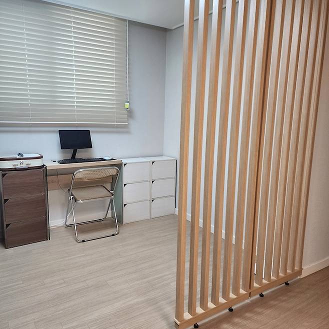 저희 집 안방이 가벽 치고 방 하나를 더 만들어도 되는 사이즈라 한쪽 공간은 자는 공간, 한쪽 공간은 제 영상 편집 작업 공간으로 사용하고 있어요. 작업 공간은 아주 심플해요. 좀 분리된 느낌을 주고 싶어서 우드 스트라이프 파티션을 설치했는데 설치도 쉬운 편이고 공간 분리할 때 참 좋은 아이템인 것 같아요. 침대 옆에 둔 공간박스를 작업 공간에도 두고 수납공간을 늘렸습니다.