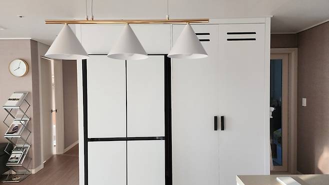 식탁 등은 셀프로 교체했습니다. 골드 스틸 바디에 화이트 갓이 매력적인 심플하면서도 고급스러운 느낌의 조명이에요. 냉장고는 비스포크 새틴 화이트 색상이에요. 어찌 보면 굉장히 무난하지만 저희 집에는 찰떡으로 잘 어울려요.