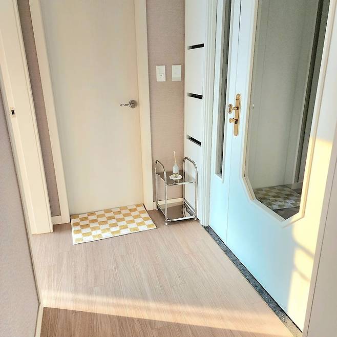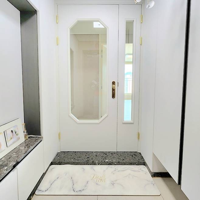 현관과 욕실 바닥은 입주하기 전에 줄눈 시공을 했어요. 지내다 보니 줄눈 시공은 하길 정말 잘했다는 생각이 들어요. 청소하기도 쉽고 되게 깔끔해 보입니다. 제가 중문을 시공할 때 방향을 현관 쪽에서 당기는 방향으로 선택해서 발 매트를 하나 두고 사용 중이에요. 현관은 집의 첫 인상을 결정하기 때문에 머리카락이나 먼지 없이 깨끗하게 유지하려고 노력하고 있어요.