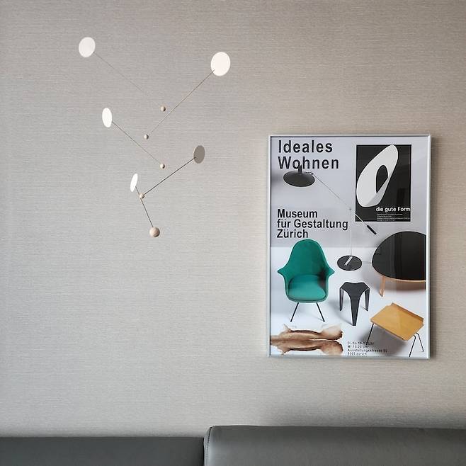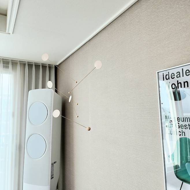 소파만 두기에는 너무 허전해서 모빌과 액자를 걸어뒀어요. 액자는 제가 미드센추리 모던 감성의 카페를 갔었는데 카페에 있던 포스터가 정말 제 취향이더라구요! 그래서 검색해 보고 결국 찾아서 주문을 했답니다. 뮤어(MUUR)에서 주문했고, 해외 배송이라 2주 정도 걸렸는데 기다린 시간이 아깝지 않았어요. 벽에 못질하는 게 싫어서 꼭꼬핀과 점토 점착제를 사용해서 고정시켰습니다.