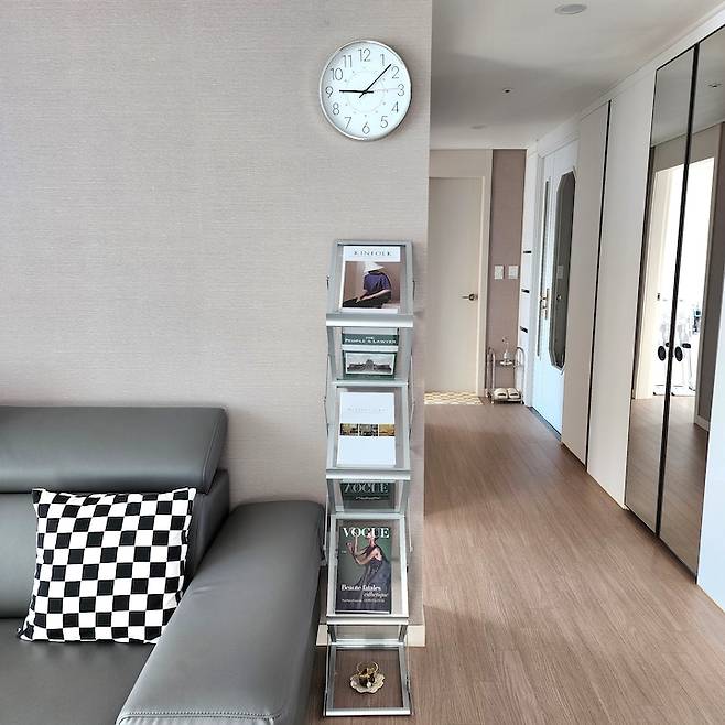 소파 오른쪽 옆에는 미드센추리 느낌이 물씬 나는 매거진 랙과 시계를 걸어 두었어요.