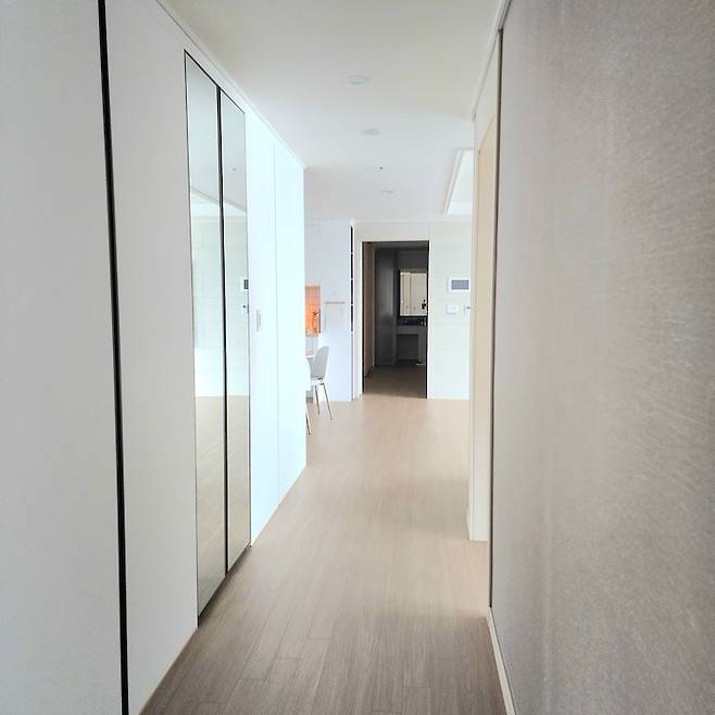 현관에서 바라본 복도의 모습이에요. 팬트리와 방들을 지나면 거실과 주방, 안방이 나와요.