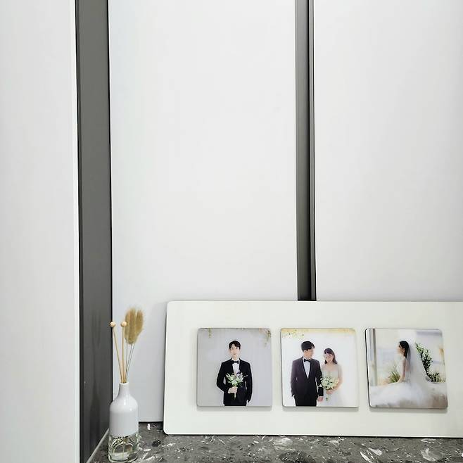 신발장 한쪽 공간은 아예 사용을 하지 않아서 이 공간에 저희 웨딩 액자와 디퓨저를 뒀어요. 현관 문을 열고 들어와서 웨딩 액자를 딱 보면 지나간 추억도 떠오르면서 기분이 좋아져요.