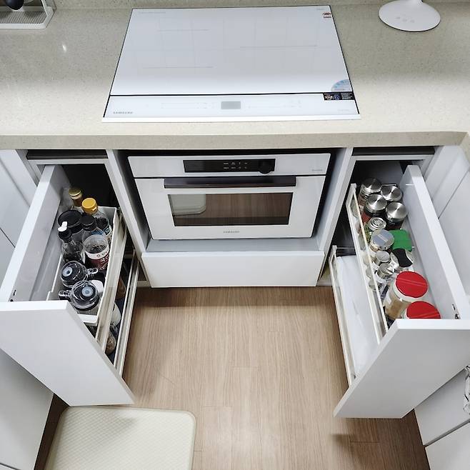 원래 옵션으로 있었던 빌트인 오븐을 제거하고 비스포크 직화 오븐을 넣었어요. 에어프라이어, 오븐, 직화 오븐, 전자레인지 기능까지 다 돼서 너무 만족하며 잘 사용 중인 가전템 중 하나 입니다.
