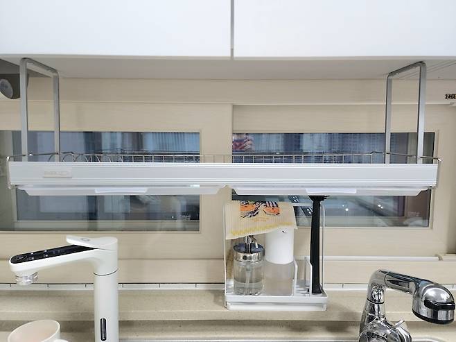 식기 건조대는 부착식 제품을 설치했어요. 저는 스탠드형보다 이렇게 상부장에 설치하는 부착식 제품이 공간 활용에 더 좋은 것 같아요. 그리고 아래쪽에 수세미, 세제통, 세척솔, 행주를 한 번에 거치할 수 있는 올인원 수세미 거치대를 두고 사용 중인데 한 번에 정리가 되니 확실히 깔끔해요. 행주는 셀룰로오스 행주를 한 번 사용한 후부터 셀룰로오스 행주로 정착해서 사용 중입니다. 사이즈도 작고 물 흡수도 잘 돼서 딱 제 스타일이에요.