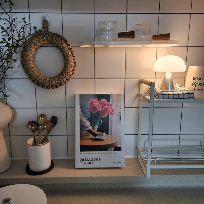이 공간은 식탁 바로 옆 공간인데요, 요리를 위한 공간보다는 다이닝을 위한 공간이에요. 식사의 행복함이 배가 되도록 제게 개인적으로 의미가 깊은 아이템들과 예쁜 아이템들로 꾸며 보았어요.