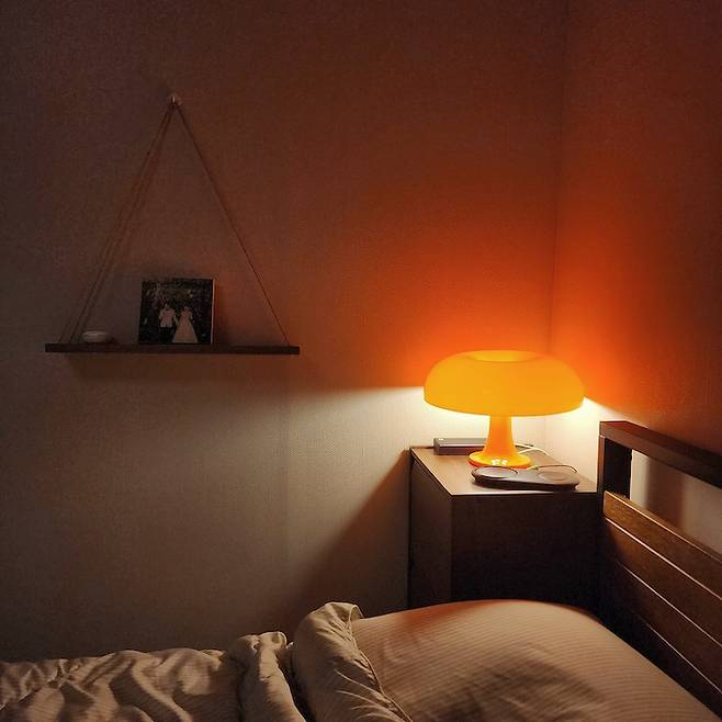 주황색 무드등이 너무 튀지 않을까 걱정했는데 오히려 안방의 포인트가 되면서 분위기를 업그레이드 시켜주고 있어요.