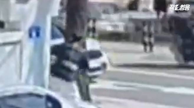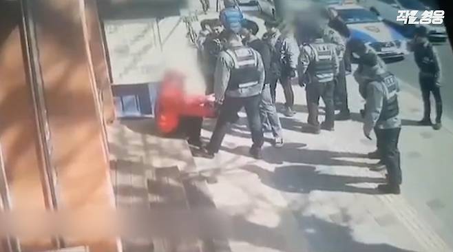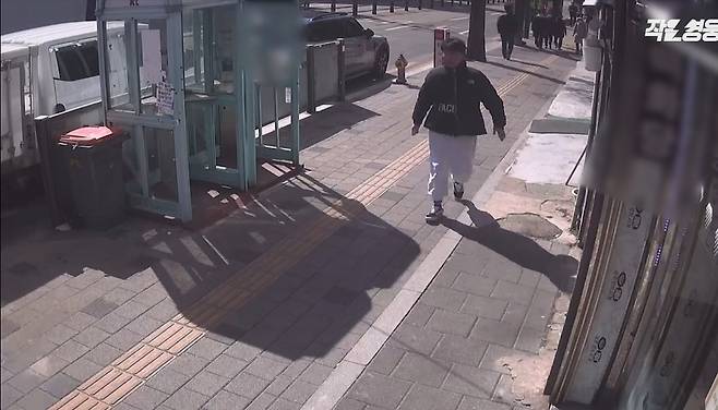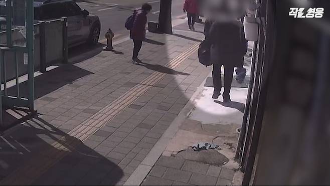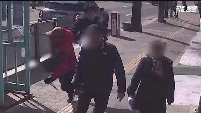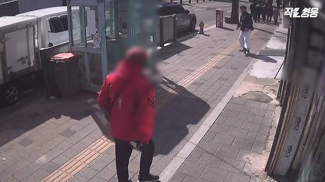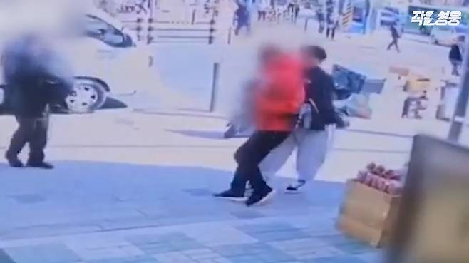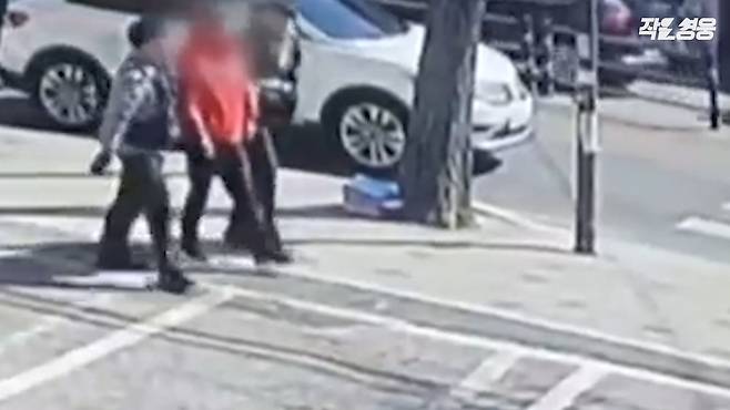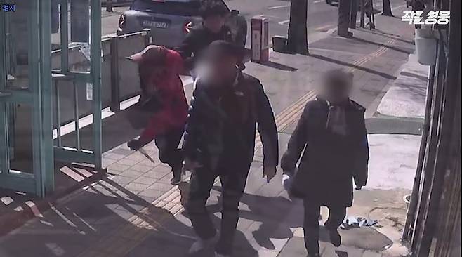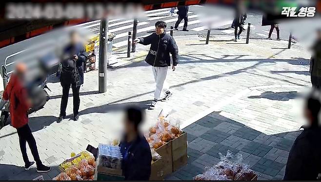 과일가게 사장님이 괴한을 유인하자, 이렇게 대걸레 같은 걸 들고 돕기 위해서 쫓아가는 시민도 나타났어요. 그러다, 한순간, 과일가게 사장님이 기회를 잡았습니다.