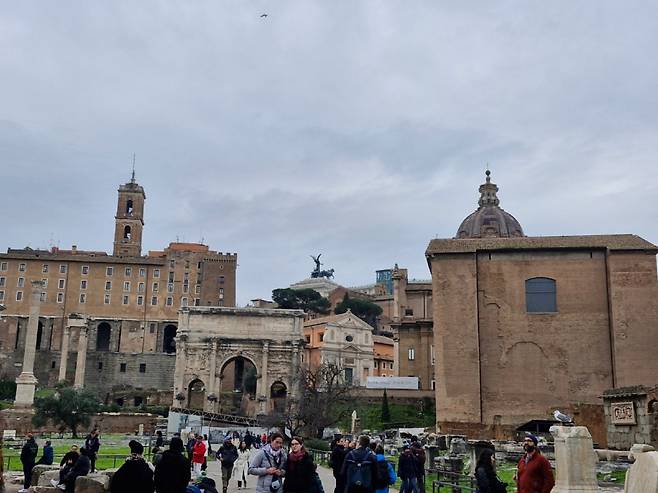 우리는 로마에 오기 전에 콜로세움과 포로 로마노, 팔리티노 언덕까지 입장할 수 있는 통합권을 미리 예매했다. 티켓을 보여주고 언덕 위에 올라가면 개선문 같은 게 하나 있다. 콜로세움 옆에도 더 큰 개선문이 하나 있는데 콘스탄티누스 개선문이다.
